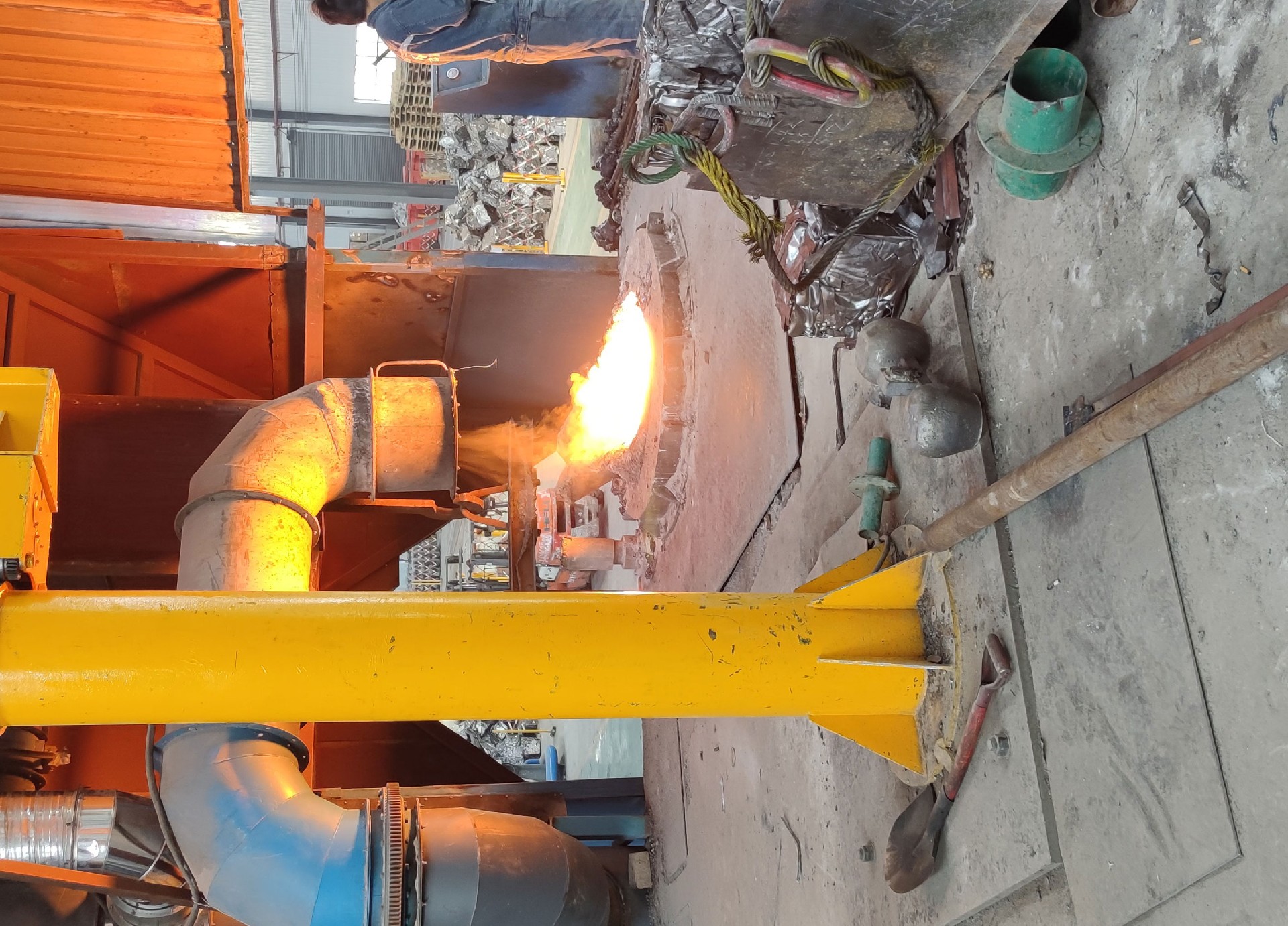 電爐除塵器裝置系統(tǒng)為:將來自工業(yè)硅生產(chǎn)電爐的煙氣,在離心式主風(fēng)機的抽吸作用下,煙氣由半封閉式電爐內(nèi)引出,沿著煙道首先進入旋風(fēng)除塵器。把粗粒、火星分離出來,使其沉降于灰斗至卸料器排出。在有旋風(fēng)除塵器的出口排出,超細(xì)粉塵及含塵氣體進入一個熱交換器,風(fēng)冷降低煙氣溫度,然后其它塵粒隨氣流上升進入布袋除塵器各個袋室。經(jīng)濾袋過濾后,粉塵被阻留在濾袋外面,凈化后的氣體由濾袋進入箱體,再通過袋口和上箱體(凈氣室)出風(fēng)口進入離心式主風(fēng)機在排入煙囪至大氣。灰斗中的粉塵定時或連續(xù)由卸灰系統(tǒng)排出。