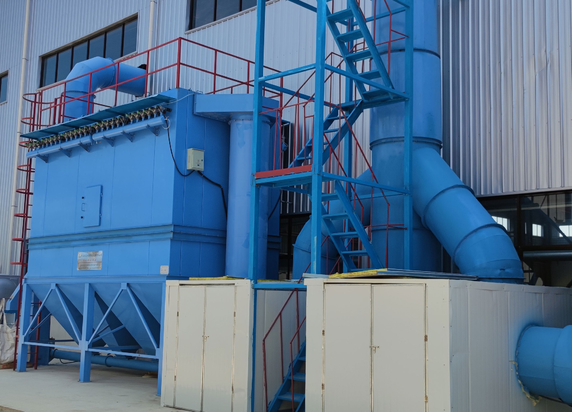 電爐除塵器裝置系統(tǒng)為:將來自工業(yè)硅生產(chǎn)電爐的煙氣,在離心式主風(fēng)機的抽吸作用下,煙氣由半封閉式電爐內(nèi)引出,沿著煙道首先進入旋風(fēng)除塵器。把粗粒、火星分離出來,使其沉降于灰斗至卸料器排出。在有旋風(fēng)除塵器的出口排出,超細粉塵及含塵氣體進入一個熱交換器,風(fēng)冷降低煙氣溫度,然后其它塵粒隨氣流上升進入布袋除塵器各個袋室。經(jīng)濾袋過濾后,粉塵被阻留在濾袋外面,凈化后的氣體由濾袋進入箱體,再通過袋口和上箱體(凈氣室)出風(fēng)口進入離心式主風(fēng)機在排入煙囪至大氣?;叶分械姆蹓m定時或連續(xù)由卸灰系統(tǒng)排出。