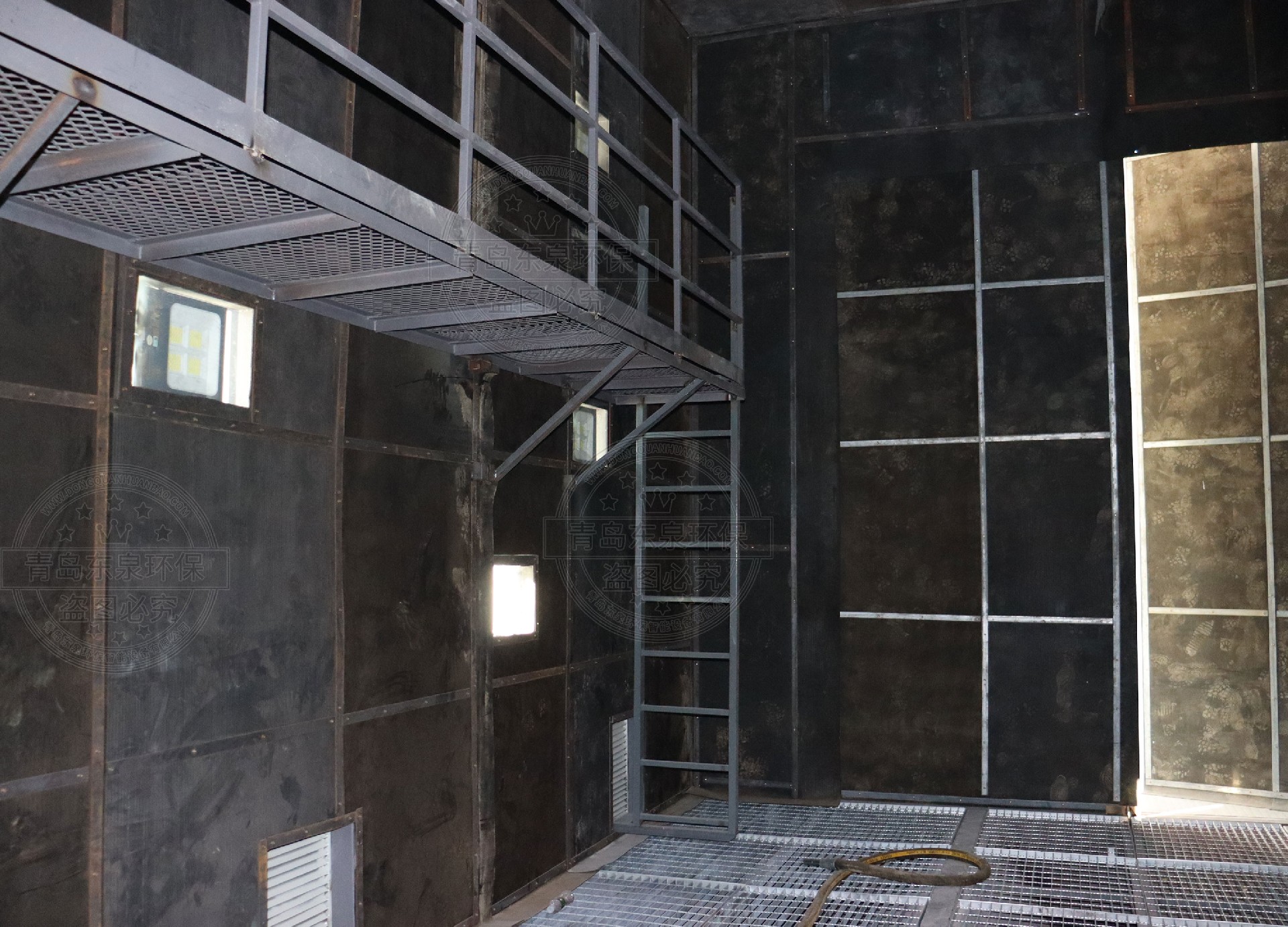 5)采用型鋼做室體框架,外面覆蓋50mm厚彩鋼夾芯板。室體內(nèi)部滿鋪1.5mm鋼板,減少鋼丸沖擊及損壞;內(nèi)襯3mm耐磨橡膠板,防止丸料對板壁的沖擊磨損,噴砂室兩端開門。在噴砂室體兩側(cè)各配置1個工作安全門,便于操作人員調(diào)整噴砂主機(jī)和對設(shè)備進(jìn)行檢修及出現(xiàn)故障時安全撤離。在噴砂室側(cè)壁和大門上配置透明觀察窗。