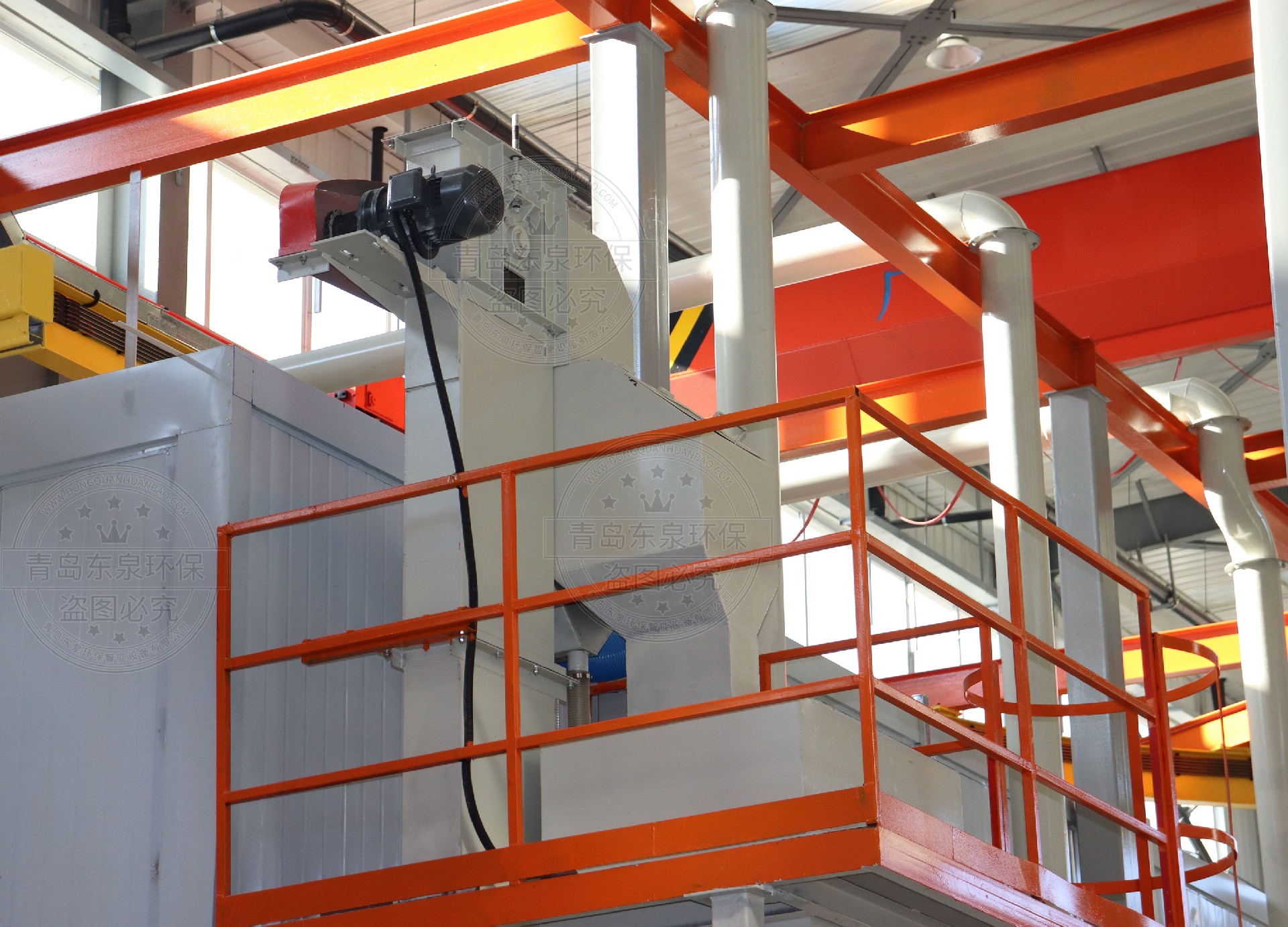 6)回砂采用三組氣動刮板回砂方式,外形簡潔美觀,節(jié)省設(shè)備的占地面積,無需大量基建,回砂量大,檢修方便,在回收到皮帶輸送機(jī)后,經(jīng)過分離進(jìn)入儲料斗,最終進(jìn)入噴砂罐,輸送系統(tǒng)采用柔性設(shè)計(jì),減少對鋼砂的擠壓,機(jī)械輸送造成的快速磨損等。